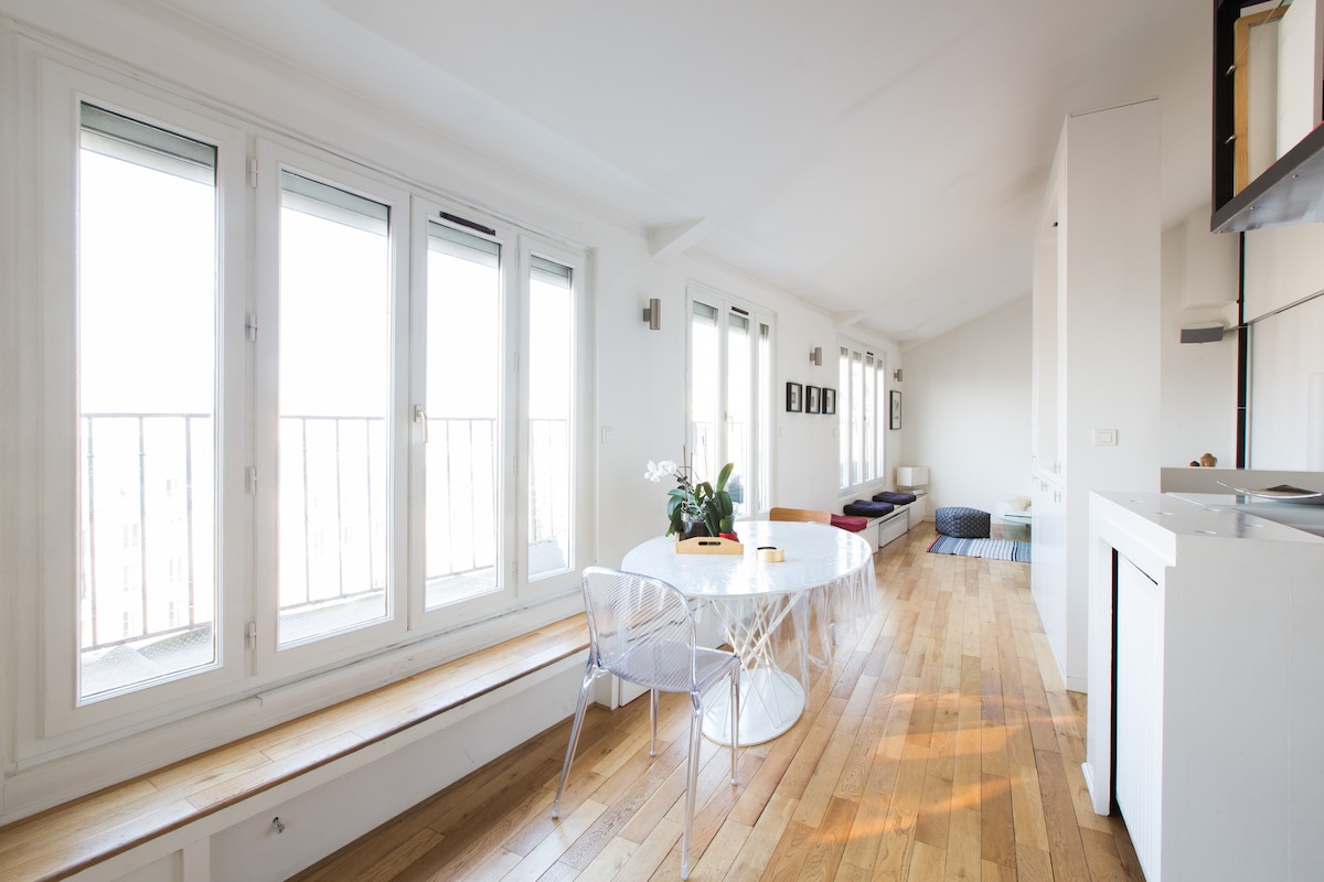 位於巴黎市中心的絕佳閣樓,一側可欣賞聖心堂( Sacré-Coeur )和屋頂的獨特景觀,另一側甚至還有埃菲爾鐵塔( Eiffel Tower )。 我們住在一棟非常舒適的巴黎建築的五樓。
