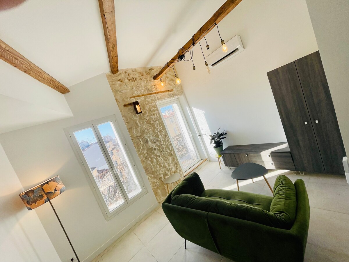 這是一間位於舊港口小巷的舊藝術家工作室。 這間翻新的閣樓位於獨特的環境中,是舒適、溫馨和設計的小寶石,距離港口最美麗的船隻、酒吧和餐廳僅一步之遙……位於馬賽最具代表性的區域的中心! 這間 60 平方公尺的大套房,溫馨舒適且隔音完美,讓您在入住期間,步行探索「沉睡美女」(La Belle Endormie)的魅力,同時享受真正的寧靜舒適。