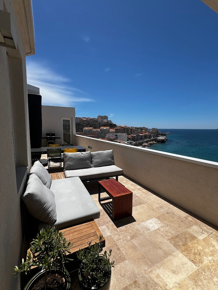Logement entièrement rénové, situé au 8ème et dernier étage d'un immeuble historique avec ascenseur et doté de 2 grandes terrasses surplombant la plage des Catalans, offrant une vue mer, corniche et rade de Marseille à 180 degrés. Comme une maison sur le toit, ce logement unique est proche de tous les sites historiques (vieux port à 10 min à pieds, Endoume à 5 min) et commodités (tous commerces à proximité immédiate).