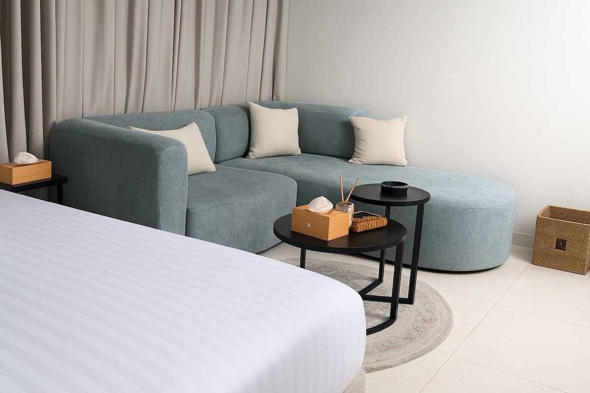 現代化的單間公寓,設計精緻,提供舒適和隱私,並提供智慧自助入住。 包括一張特大床、優雅的座位、按摩椅、完整廚房和配有按摩浴缸的豪華浴室。 如有需要,可提供飯店式清潔服務。 巧妙地利用空間、時尚的家具和平靜的觸感。 距吉達機場僅 5 分鐘。 快速 WiFi、75 吋電視、免費 Netflix。 安靜的大樓,有電梯和私人停車位。 完美住宿所需的一切設備與服務。