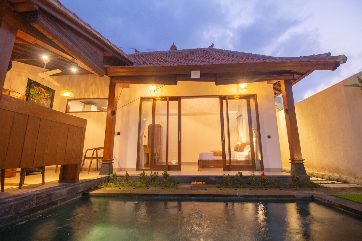 Luxurious private villa with 6x3 meter pool. Secure, private, safe. Lush garden and sheltered but open air kitchen for dining and relaxing by the pool. Queen bed, outside tub and shower, with fish pond view, fully equipped kitchen. AC, TV, great WiFi, daily cleaning and set breakfast is included. We are an 8 minute walk from the main road, or a short scooter ride. This means peace and quiet, and no car noise. Our staff will be happy to drive you in by scooter if needs be.