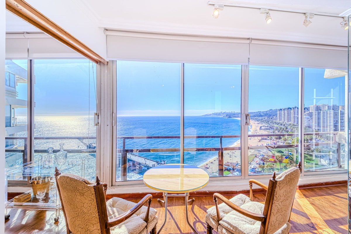 完美的公寓,享有海景。地理位置優越,設有私人停車場,並配備了在比尼亞德爾馬度過美好假期所需的一切。聖馬丁大道 (Avenida San Martin),海濱第一線。可使用獨家花園,這是一個綠色空間,您可以在此放鬆身心,享受寧靜。 靠近超市/餐廳/酒吧/享受大道賭場。距離Mall Marina Arauco購物中心4個街區,距離Libertad大道2個街區,位於Vergara碼頭對面。