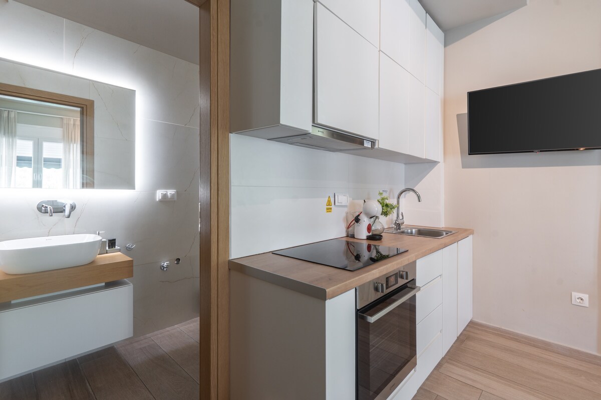 The studio in Athens is a modern 19 m² retreat designed for two guests. Bright and comfortable, it offers air conditioning, Wi-Fi, a TV, and a private balcony to relax after exploring the city. The compact open-plan kitchen is equipped with essentials for light cooking. Perfect for couples or solo travelers, this cozy space makes an excellent base to discover Athens.
