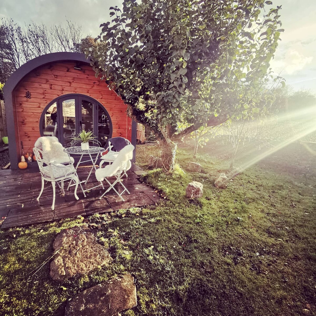 A private, cosy pod nestled right on the edge of the cotswold way, perfectly situated for taking long walks and having dinner at an abundance of welcoming country pubs, before returning to relax in the hot tub to star gaze with a bottle of bubbly. The pod is an idyllic bolthole to escape the rat race, cosy up and read a book with a fresh coffee, cook sausages and toast Marshmallows on the fire in our undercover seating area or go and explore historic neighbouring villages and the city of Bath.