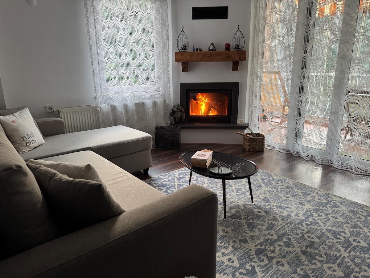 美麗的景色。在露臺上享受露臺秋千和燒烤。 冬季使用天然氣供暖。 一間臥室和兩間開放式客廳。開放式廚房。臥室有加大雙人牀。客廳共有4張沙發牀。樓下陽臺上有玻璃,露臺上有薄荷。乾淨、方便。 7月。我們的房子每個房間都有我們的景觀。一起享受和快樂。