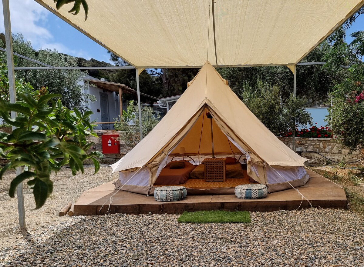 The bell tents are nestled between pistachio and olive trees. The bell tents are equipped with plush bedding, electricity and electric sockets with a plethora of usb ports, a pedestal fan and a clothes-hanger. We guarantee protection from nature creatures - mosquitos and bugs don't stand a chance with the 360-degree mesh wall and the mesh door. The luxurious shared toilets and showers are located just a few meters away from the tent. There is a private area with a picnic bench and a hammock.
