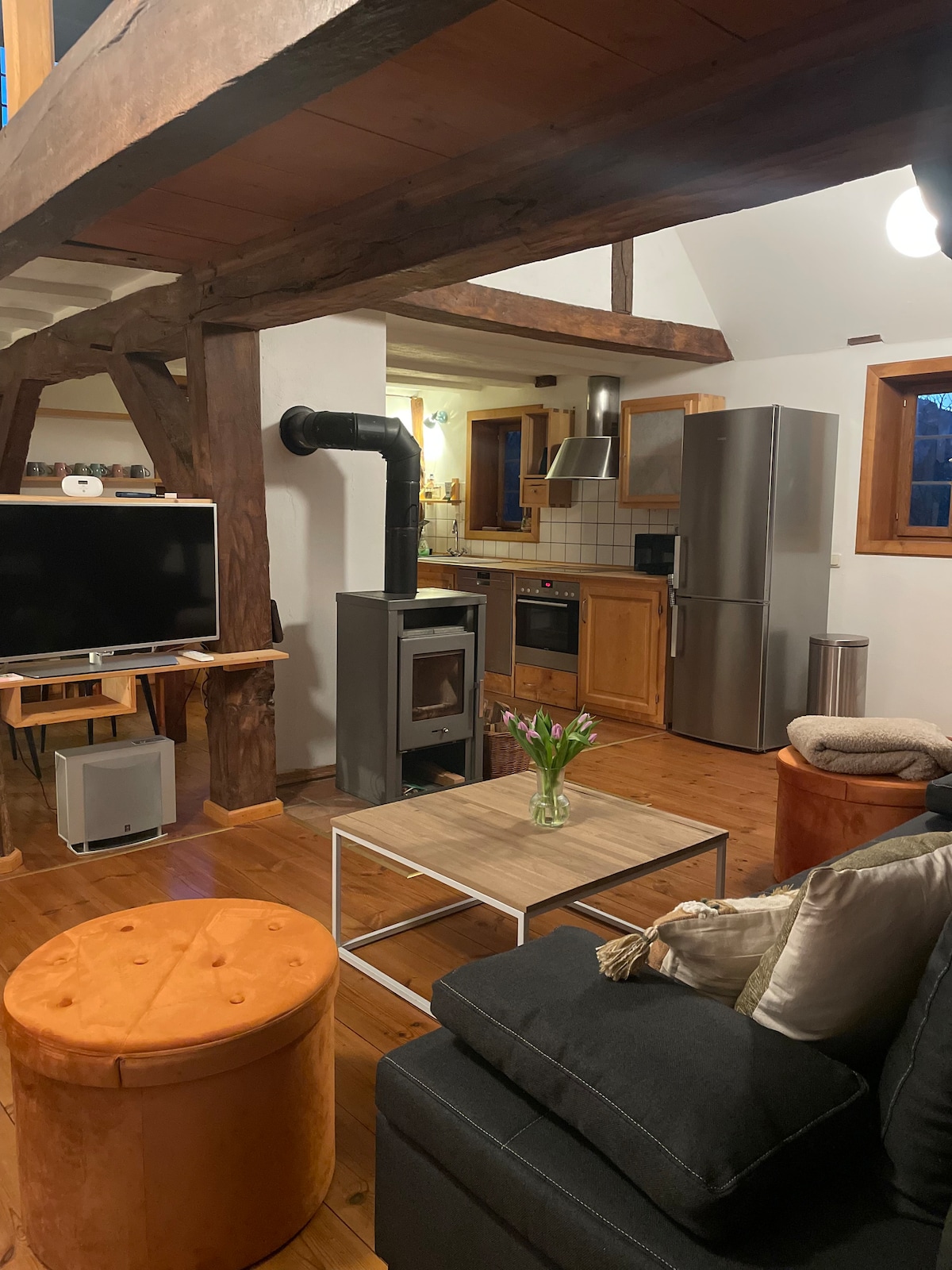 來到這個無與倫比的度假勝地,重新與大自然和諧相處。純粹的寧靜與寂靜,以及一望無際的田野和草地。 歡迎來到我們的小夢想,享受舒適和隱退。鹿、狐狸和野兔會經過露台。光線充足的空間概念為您提供獨特的景觀。 設備齊全的廚房邀請您來烹飪。淋浴間和乾式廁所、床單和毛巾、壁爐。