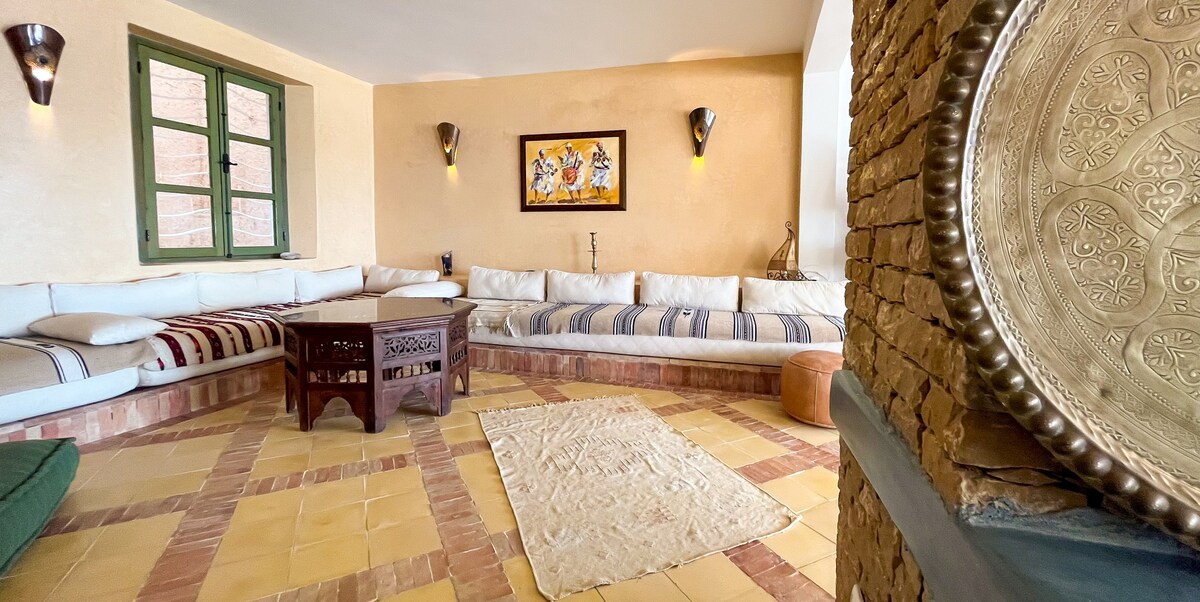 Profitez de cet incroyable logement à la situation unique ! Construit littéralement sur la côte de la baie d'Aghrod, dans le sud du Maroc, notre vaste appartement - de plus de 250m2 - vous offre un accès privilégié à la plage de sable fin. Rien de plus simple : il vous suffit d'ouvrir la porte et vous y êtes ! Avec sa large terrasse, équipée et baignée de soleil, ses chambres et salons spacieux, au charme authentique, et son patio discret, notre logement vous assurera détente et dépaysement !
