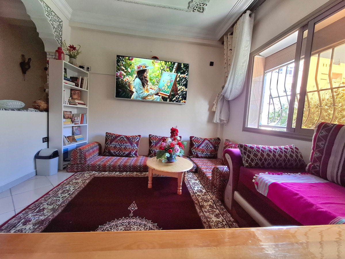 Excellent, bright apartment in Agadir, host city of the 2025 Africa Cup of Nations, just a 2-minute walk from the bustling Souk Elhad bazaar, offering all the comforts needed for a pleasant stay. It includes: 2 bedrooms: one with a double bed and the other with two twin beds, a living room with IPTV and Wi-Fi, a dining room, a fully equipped kitchen, a bathroom with toilet, and a spacious terrace perfect for relaxing. The location is close to all amenities and the city center. 2km from the beach