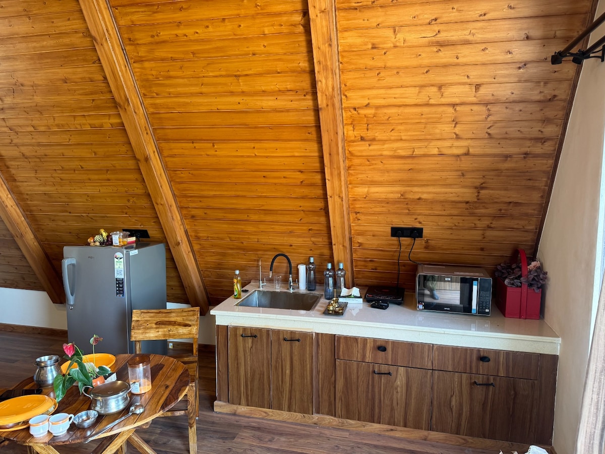 Crafted and Hosted by a couple in an offbeat Himachal village, Ruah is a handcrafted wooden A-frame Chalet at the perfect elevation for pleasant weather all year- breezy summers and warm winters. A serene mountain retreat for those seeking stillness, breathtaking sunsets and fresh air. Enjoy farm-to-plate meals, candle light dinners, explore trails, the chirping of birds by day and the harmony of crickets beneath starry skies from the attic. Come home to Ruah to unwind and relax.