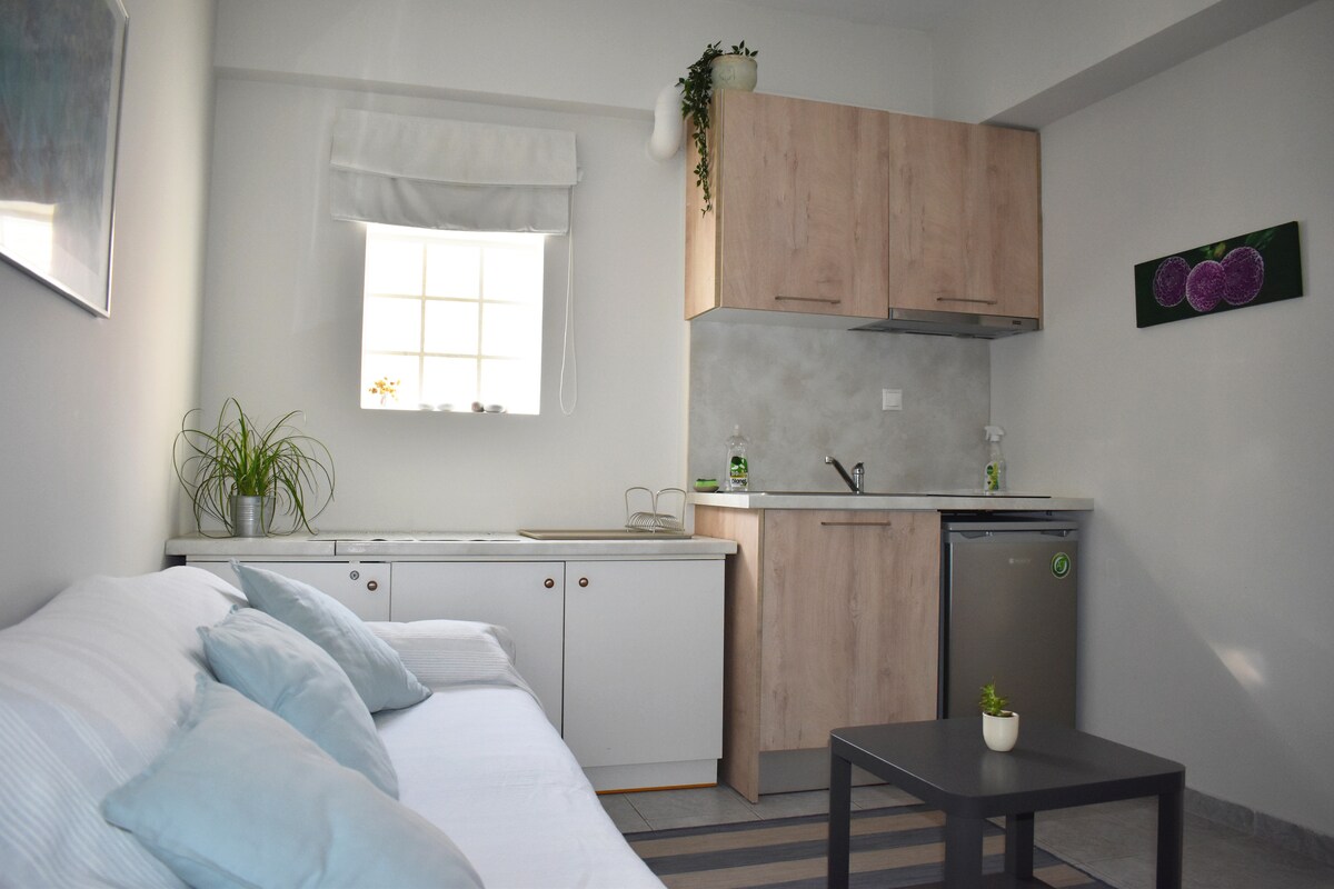 Newly, completely renovated 1st floor studio in the heart of Kalamata, in the immediate vicinity of the Central Square and International Dance Center. It has 1 king size bed and a fully equipped kitchen. Modern, well-furnished and fully functional. It is suitable for couples, families with infants, professionals or anyone else who desires relaxation and tranquility.