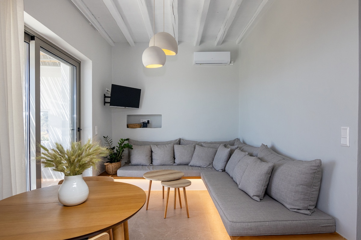 在米科諾斯市的時尚豪華套房(「Legends in Town」)欣賞愛琴海景。 由獲獎的建築師設計。 在日落時分,在配有按摩浴缸的私人露臺上喝一杯葡萄酒。 在配有高品質床墊的加大雙人床上放鬆身心。 步行即可抵達米科諾斯鎮的餐廳和精品店 摘要 *時尚海景 *露台按摩浴池 *加大雙人床、高品質床墊 *位於中心但安靜 *美麗的日落