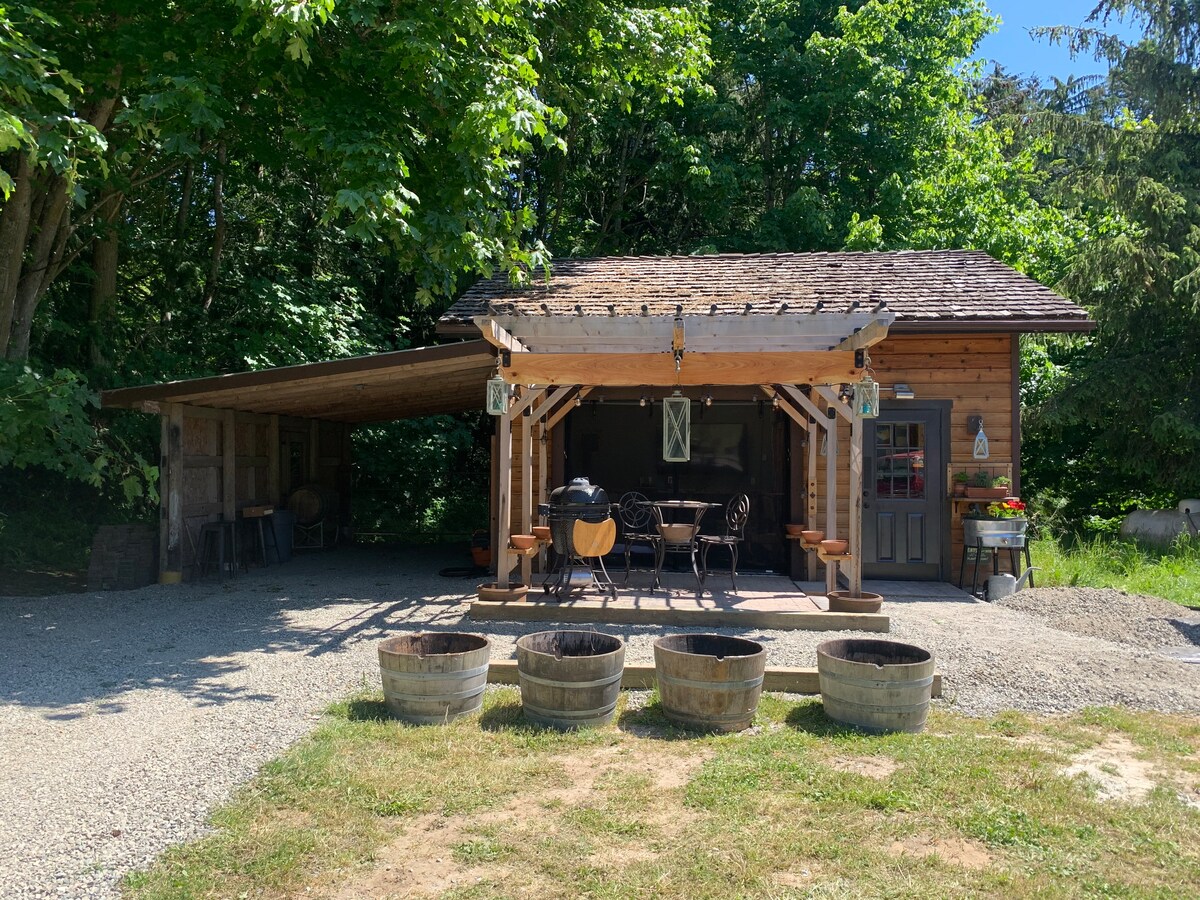 完全隱私.....小型、設備齊全的公園模型客用住房,配有電壁爐、臥室(雙人床)的電視以及客廳的電視、小型木炭燒烤爐,位於距離私人住宅5英畝的車道對面,距離安吉利斯港市中心5英里。美麗的景觀,有鱒魚池、大院子、灌木叢上的季節性漿果、花園裡的農產品、雞舍裡的新鮮雞蛋和釣鱒魚釣魚。