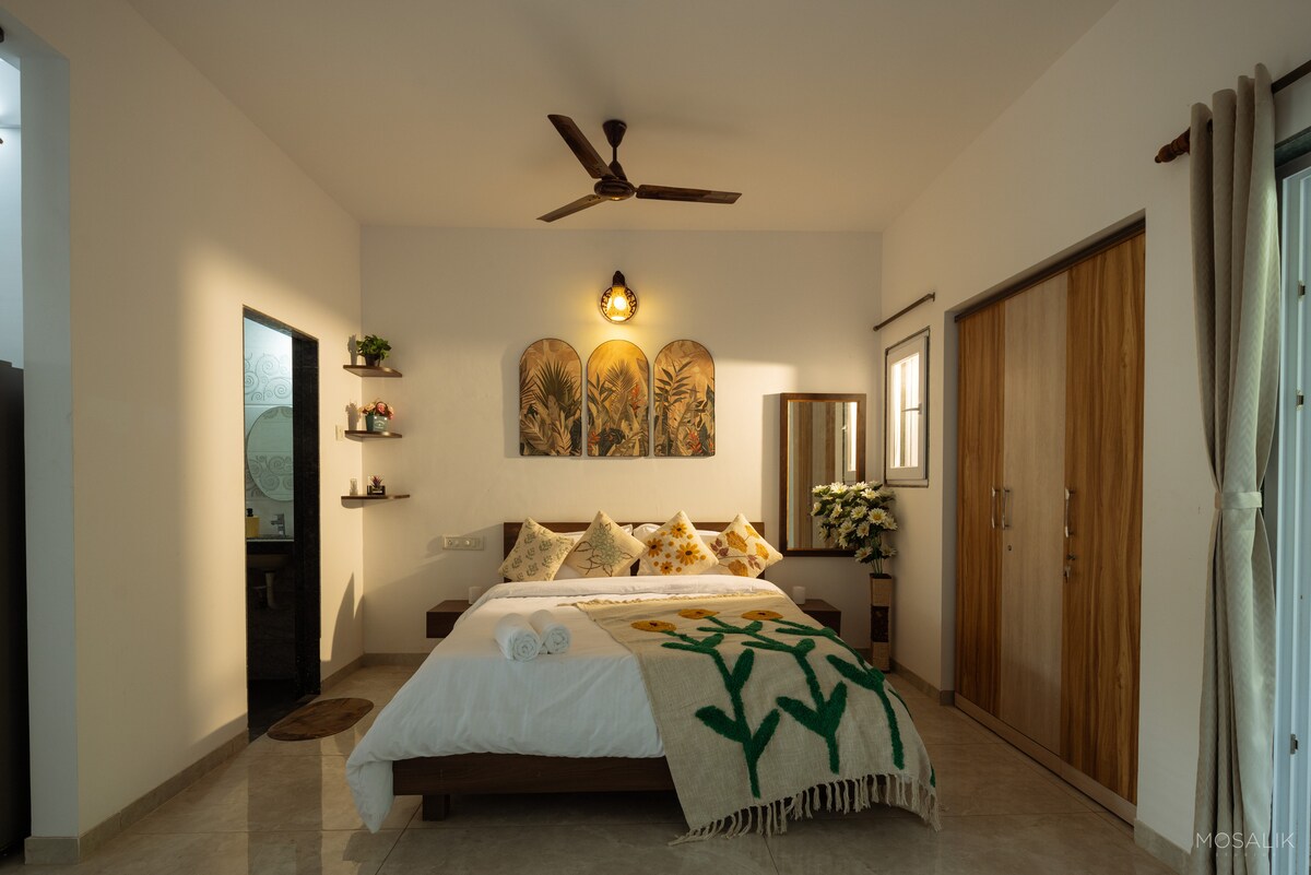 非常適合在 Isavyasa Retreats 尋求寧靜的情侶和單身人士!逃到我們的「寧靜」單間公寓、個人露臺,欣賞迷人的日落景觀,並可前往私人海灘。在設有泳池的安全門禁社區體驗印度-葡萄牙建築。遠距工作人員可享用高速WiFi、備用電源、空調、微波爐和設備齊全的小廚房。 這個浪漫的隱藏處擁有精美的馬賽克地板、牡蠣殼窗戶和阿茲勒喬瓷磚,讓您回到一個被遺忘的時代。