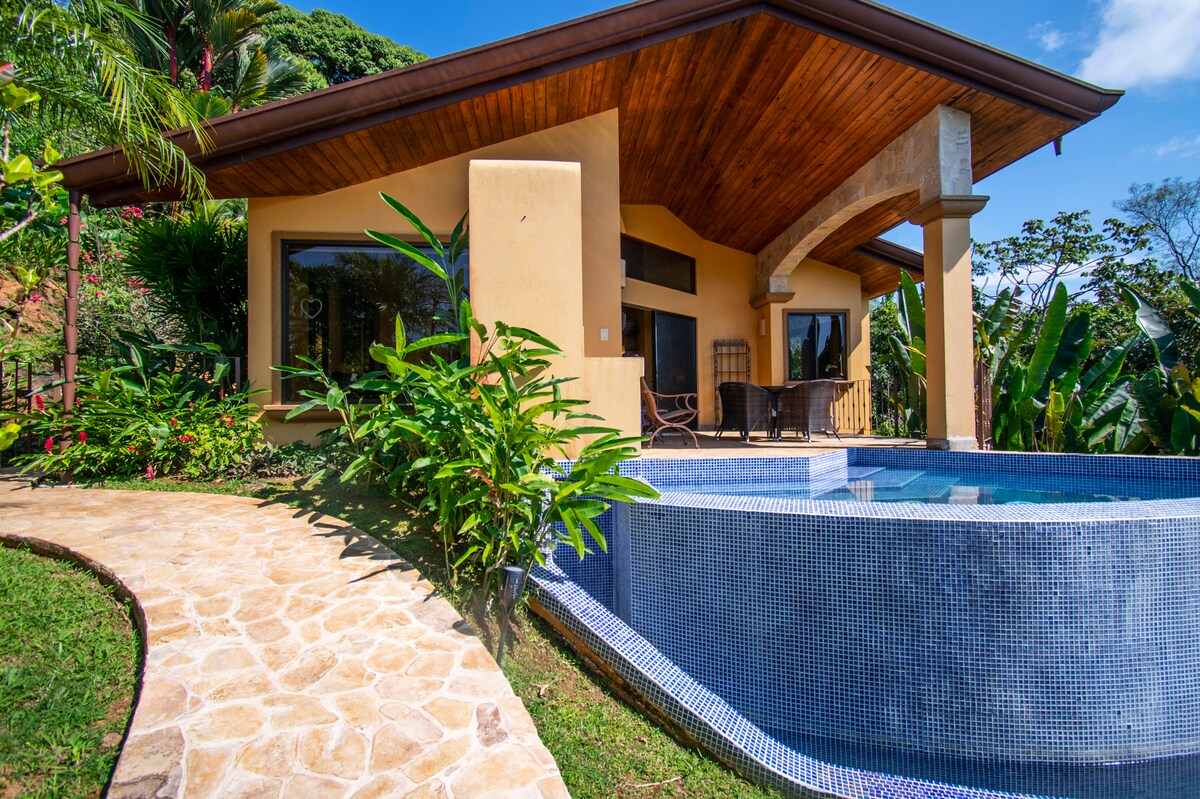 4bd 2ba modern home - on the mountain, in a rain forest overlooking the ocean! Located high above Uvita, you'll feel disconnected from it all, yet only 12min from downtown & FAST wifi! The 180° views will stop you in your tracks. And of course there’s a pool to cool off in while enjoying a timeless vacation on a 66 acre oasis in the clouds. So whether it be a coffee or tea, a glass of wine, a cold drink it will pair perfectly with a Costa Rican sunset served daily.