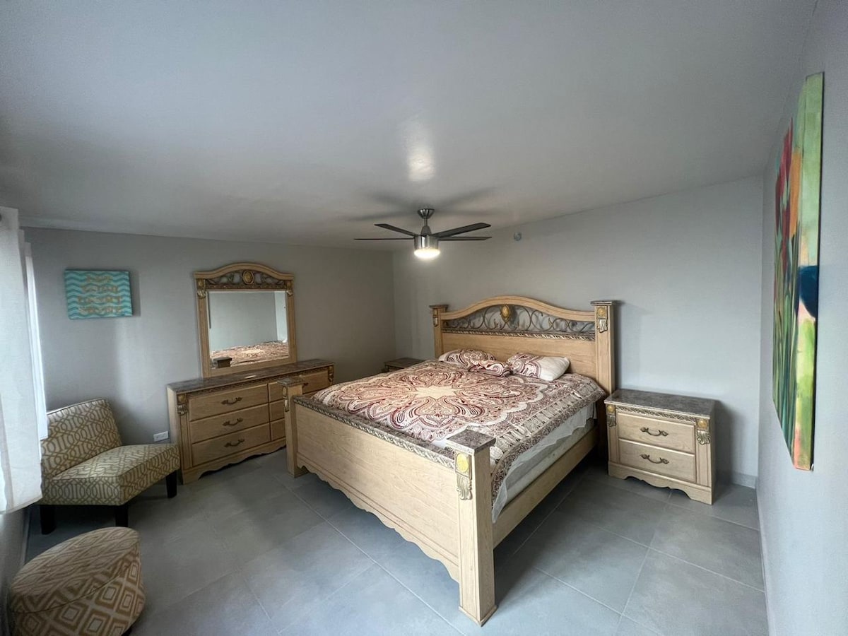 Omega Black, New Apartment 7 min from Colosio Av. Amazing view from 8th floor, TV 75", 65" and 58", private terrace, Optional AC for main bedroom $50 per night. 24 Hr security guard, private parking, and 2 elevators. Currently Building ammenities are restricted for Airbnb. Commercial center with Starbucks and Gold Gym at one side of the tower. One car allowed.
