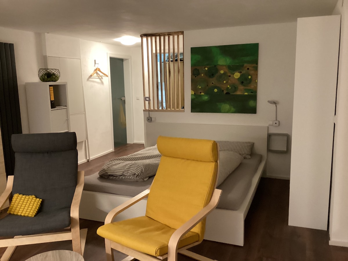 Die Wohnung befindet sich im Keller meines Hauses. Sie nutzen die Wohnung nur für sich und haben auch einen eigenen Eingang. Der Wohnbereich ist ein helles Zimmer und hat eine Fläche von ca. 26 qm². Das Sofa dient als Schlafmöglichkeit und hat eine breite von 1,40 m und reicht für 2 Personen aus. Auf dem Sofa befindet sich eine Schaumstoffaufpolsterung von ca. 6 cm. Als weitere Schlafmöglichkeit dient ein normales Bett. Parkplätze sind in unmittelbarer Nähe ausreichend vorhanden.