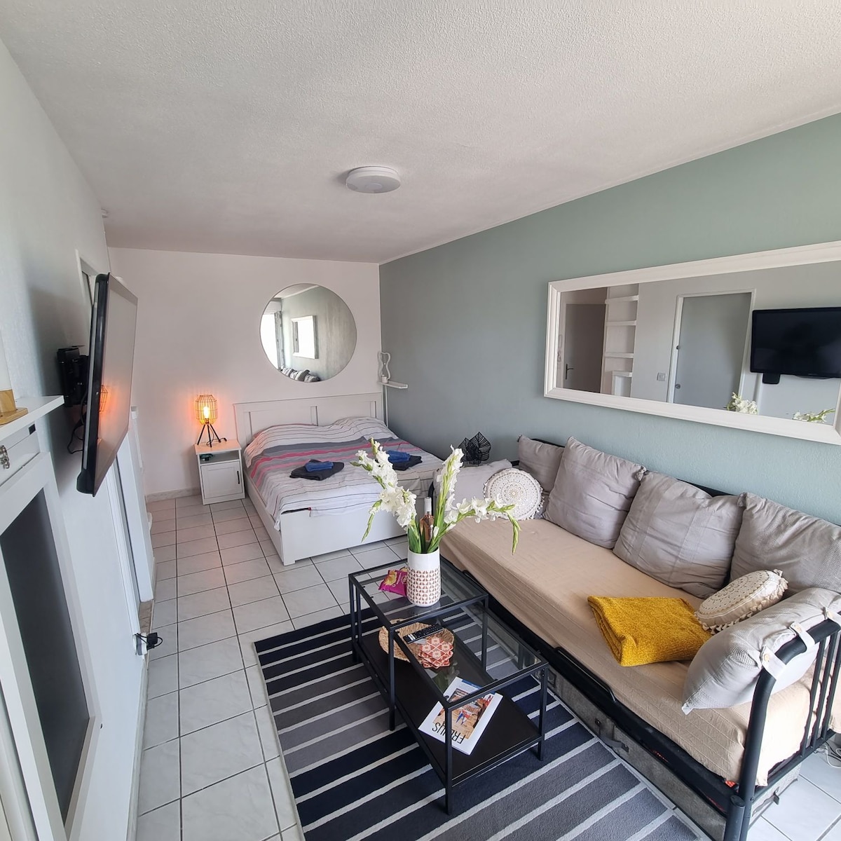 舒適的小單間公寓,配有公共泳池、私人停車位。沒有在大陽臺上。交通便利,距離海灘不遠。 小巧但oh ho