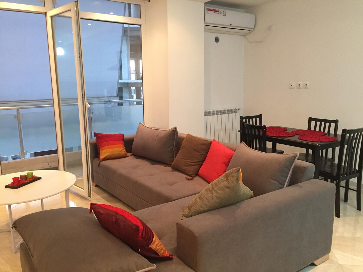 This stunning NEW apartment is located within the route national at 20 mins from central. situated on the 4th floor. The balcony gives access to an amazing sea view. Fully equiped open plan kitchen ( including a dishwasher) and dinning/ living room with TV that has French, English and Arabic channels. This flat comes with water reserve that gives access to water 24/7. Among other facilities: private parking, lift that goes from the underground parking to the flat, and an italian styled shower.