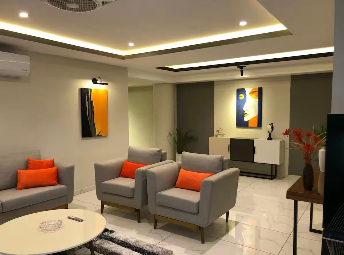 體驗我們位於Gulberg Greens的溫馨公寓的魅力,非常適合家庭和年輕夫婦。配備舒適的臥室、設備齊全的廚房和溫馨的起居區,以及配備情緒照明和溫馨氛圍的陽台,讓您有賓至如歸的感覺。 公寓位於雙子城市中心,距離Centaurus Mall和Giga Mall等熱門景點只有幾分鐘的路程。非常適合商務和休閒住宿,立即預訂,享受伊斯蘭馬巴德的家居體驗!