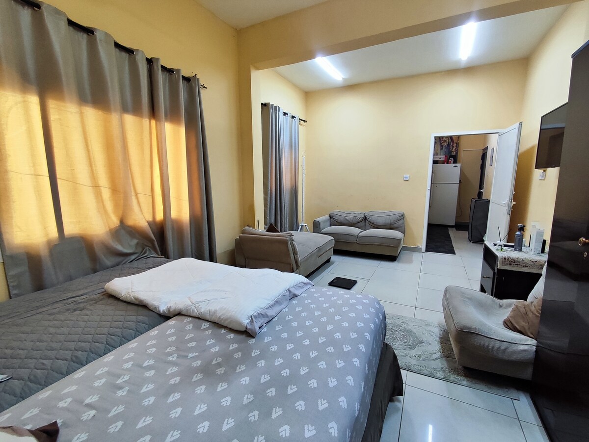 Its a small studio 360sq/feet n its equipped with all basic n modern facilities . Its in the centre of ajman easy excess to all place just 5 min drive to excess dubai road 10 min drive to beach n its surronded by restaurants n cafes n hyper markets.