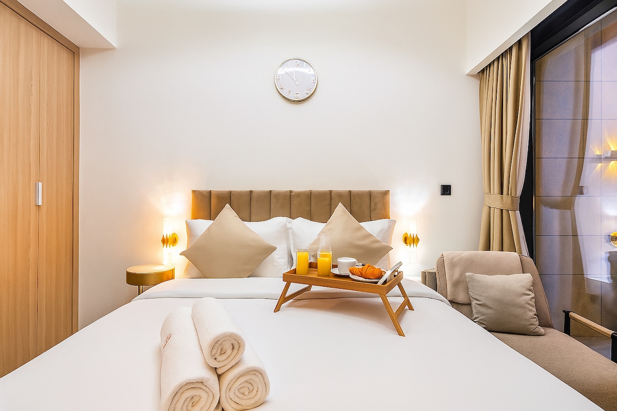 Experience elegance and comfort in our chic studio apartment with a large terrace in Downtown Dubai. Overlooking the Dubai Water Canal and within walking distance of Dubai Mall and Burj Khalifa, it’s the perfect base for your stay. Inside, enjoy a king-size bed, fully equipped kitchen, free WiFi, smart TV and complimentary parking. Whether traveling for business or leisure, our apartment blends style, comfort and location for an unforgettable Dubai experience.