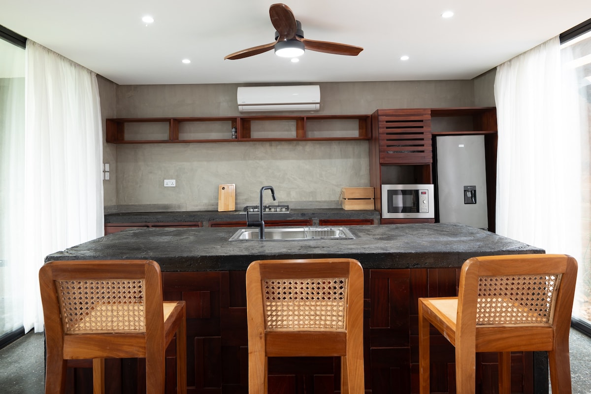 An architect’s private retreat in the Volta Region, nestled in the quiet riverside town of Vume, this home is designed to foster rest and reconnection with nature. Rammed - earth feature walls and eco-conscious materials create a naturally cool, grounded space that responds to the area’s warm, humid climate, offering a calm, tactile stay where architecture lives in harmony with its lush surroundings.