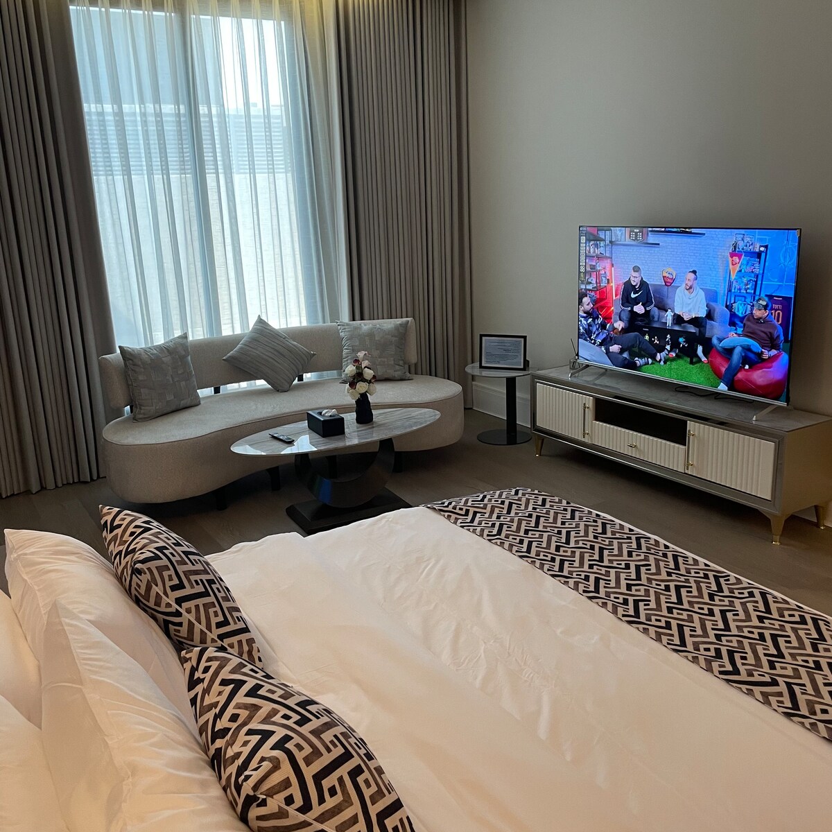 Discover a distinctive stay in a comfortable apartment in the Al Khobar city. The apartment boasts several features: 1. Smart and secure entry through a smart door lock. 2. A beautiful balcony with a View. 3. A coffee corner equipped with a coffee maker, microwave, and a small fridge. 4. A 4K smart screen. 5. Fast 5G internet connection. 1. Bahrain Bridge - within 5 minutes. 2. Rashid Mall - 10 minutes. 3. The waterfront - 5 minutes.