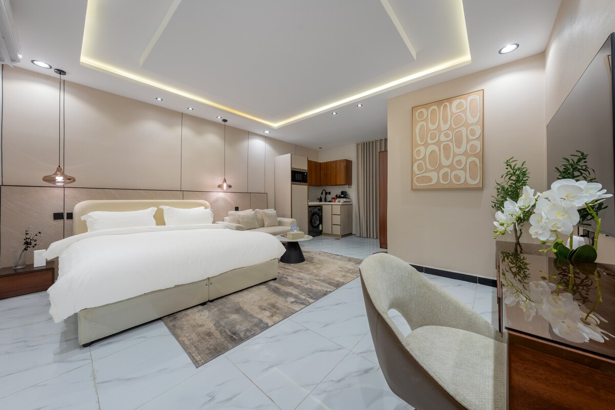 這間設計精美的豪華單間公寓位於利雅德安靜而高級的區域,體驗舒適與精緻的完美融合。 非常適合商務差旅人士、情侶或尋求優質短期或長期住宿的獨行旅客。