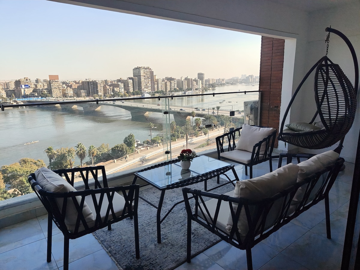 تقع الشقة علي كورنيش النيل المعادي بالقرب من وسط المدينه ومواقع الجذب المتحف المصري 7.8 كم وميدان التحرير ٧.٣ علي بعد ٢٣ كم من مطار القاهره الدولى شقة فندقيه مريحة وأنيقة وراقيه اللأزواج والعائلات تتكون من ٣ غرف رئيسيه بحمام خاص مطبخ مجهز بالكامل غرفه معيشه مع تلفزيون منطقه لتناول الطعام ٤ حمامات يمكن استيعاب ٤-٦ اشخاص إطلاله علي النيل مع تراس