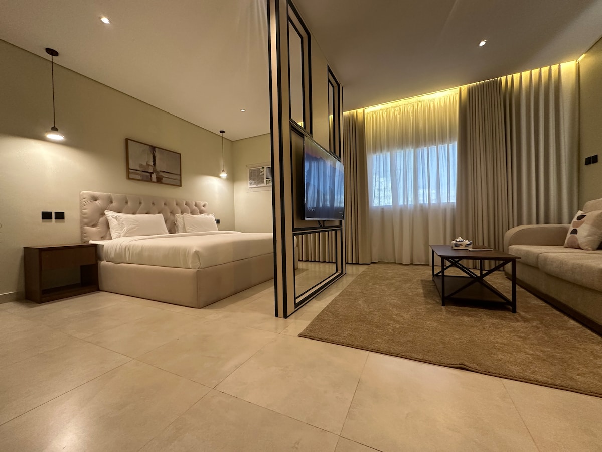 استديو مميز وقريب من المسجد النبوي، يتميز الاستوديو بشاشة ذكية في المنتصف تقسم المساحة إلى منطقتين: جهة للجلوس وجهة للنوم، مع إمكانية تدوير الشاشة بشكل دائري للاستمتاع بها من الجهتين. يتمتع الاستديو بموقع قريب من الحرم النبوي الشريف (حوالي 15 دقيقة مشيا على الأقدام)، كما تتوفر محطة عربات غولف بجانب السكن تبعد 3 دقائق مشيًا، وتتجه إلى مسار الحرم النبوي أو إلى مسجد قباء والعكس (تستغرق رحلة العربات ٣-٥ دقائق فقط إلى الحرم )حيث ان تتوفر دراجات كريم ايضا خيار مثالي لإقامة عملية ومريحة بالقرب من الحرم
