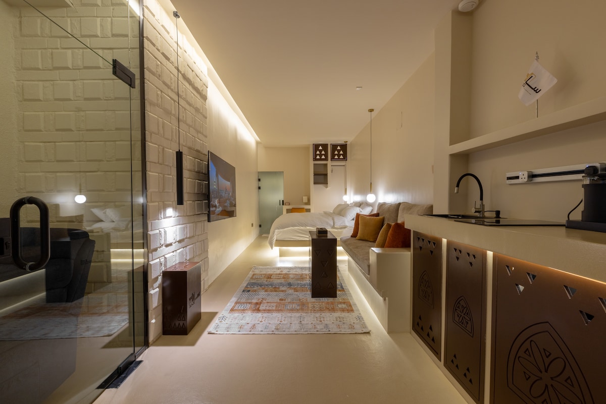 استوديو بتصميم دافئ ومريح، مثالي للراحة أو العمل. يضم سرير ماستر، شاشة 65 بوصة مع Netflix، ركن كوفي مجهز، ومنطقة جلوس. خدمة فندقية، واي فاي، طاقم نظافة ومشرف متواجد دائمًا لخدمتكم.