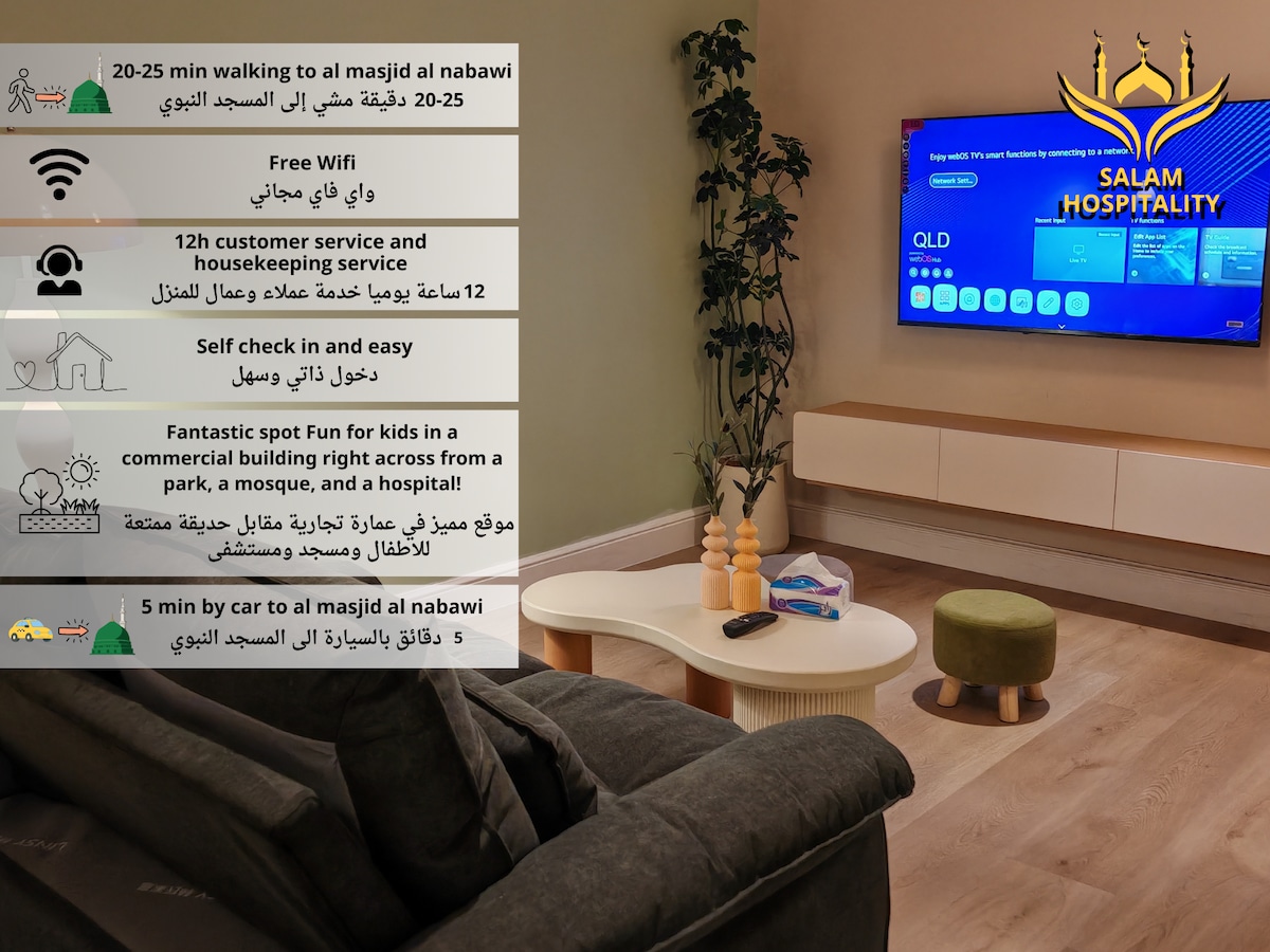 歡迎來到我們的豪華公寓, 在先知的城市中,同時享受奢華和舒適,無論您是來這裡工作還是娛樂,我們都為您提供了現代舒適的理想組合,我們精心設計的住所確保您有一個難忘的住宿,距離先知清真寺約4分鐘車程和18分鐘步行,它位於城市中心和主要街道的中心,方便客人前往所有服務、購物和餐廳