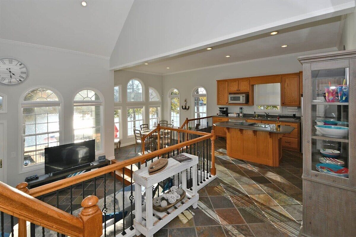 湖景• 5間臥室• 4間浴室•可睡16人•禁止攜帶寵物 這個寬敞的房源以航海為主題,具有僻靜的感覺,但位置方便,可前往別墅泳池和大型草地野餐區和遊樂場。 上層甲板上有12個座位,配有大型露臺桌、搖椅,可欣賞魏斯湖美麗的日出。 下層的門廊有螢幕。 後門廊通往度假村最大的私人後院,有一個有蓋天然氣烤架的陰涼空間,還有一個火