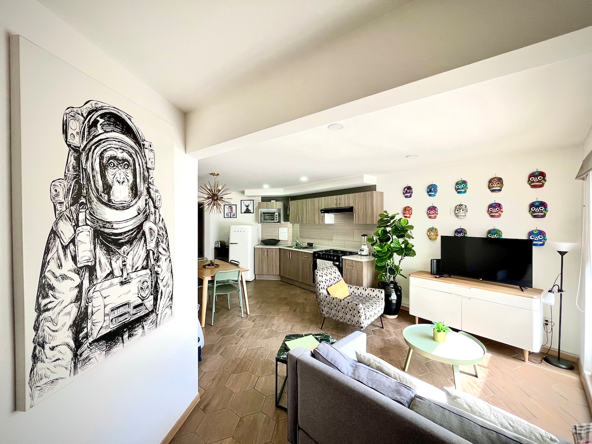 Alameda Central前面現代建築中的新閣樓,非常適合兩人入住。 配有50吋電視、電梯、配有微波爐的廚房、獨立浴室和Wi-Fi。 距離歷史中心僅10分鐘,靠近Bellas Artes、Torre Latinoamericana和博物館等標誌性景點。 非常適合在墨西哥城舒適、中心和時尚的住宿。
