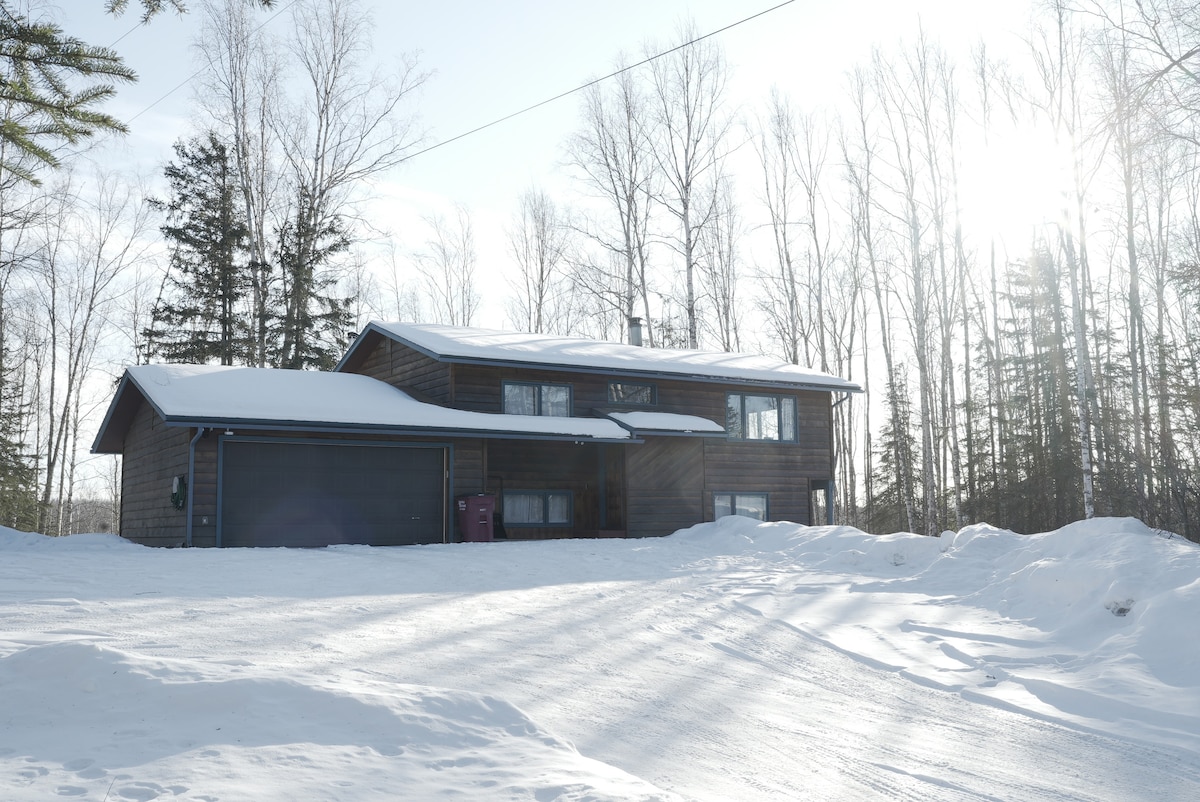 Our house will be a great addition to your vacation. We offer a hot tub and sauna. There is plenty of room to store your snowboarding gear, or just kick back and relax. There are two full bathrooms, a living room, and a workout room downstairs. We are 2.5 miles from the Dimond Shopping Center, 6.4 miles from Downtown, 4.9 miles from Hilltop Ski Hill, and and 38.8 miles from Alyeska Ski Resort. There are multiple activities and restaurants within 2 miles of the house.