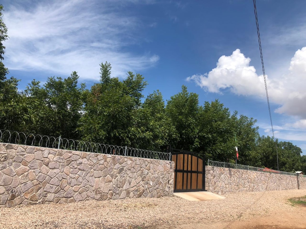 Se ubica en el Km 16 de la carretera Chihuahua-Aldama, a 20 min del centro de Chihuahua. Bonita casa con techos altos y espacio acogedor. Mi alojamiento es bueno para parejas, viajeros de negocios, familias. Son 3 recámaras king size con baño, y cocina equipada con estufa, utensilios para cocinar, platos y vasos Jardín grande para comidas o juegos. No se permiten invitados externos. NO SE RENTA PARA FIESTAS, REUNIONES NI EVENTOS!
