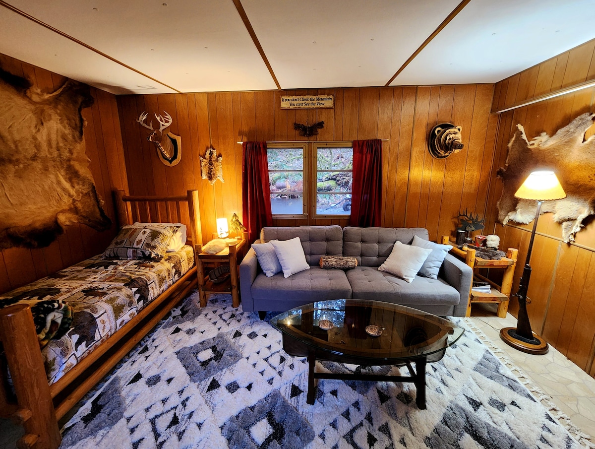 尋找安靜的地方遠離「豪華露營」-我們特別的小木屋是您的理想選擇。 小木屋很小,很舒適。 它在樓上的閣樓有一張標準雙人牀,以及一張沙發,可拉出到外面的雙人牀、有蓋廚房和私人熱水淋浴間。 有一個易於使用的Incenelet馬桶。 當您抵達時,有人會與您見面,為您辦理入住手續。 我們允許您攜帶2隻狗,每隻收取50美元費用。