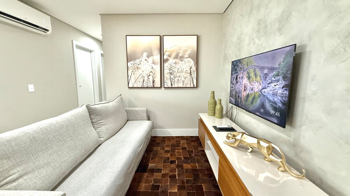 Lindo apto finamente mobiliado, totalmente climatizado. Possui 75m² com varanda fechada e vista lateral mar. Suíte com cama queen mais um dormitório com cama de casal, ambos com Smart TV. Cozinha, sala e sacada com churrasqueira integrados em conceito aberto. A cozinha é equipada com móveis planejados, fogão, forno elétrico, geladeira e microondas, além dos demais utensílios. Lavanderia com lavadora e secadora à disposição.
