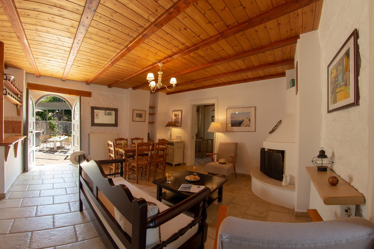房子位於Spartochori、Meganisi、Lefkas。 這是一棟安靜的家庭住宅,位於村莊入口處。 這是全新翻修的,裝飾有繪畫、鮮花和貝殼。 它有石牆,提供獨特的暖氣隔熱和壁爐、大露臺、私人停車場、美麗的海景和一個有很多花卉的大花園。 從房子步行5分鐘即可抵達村莊商店,開車2分鐘即可抵達最近的海灘。