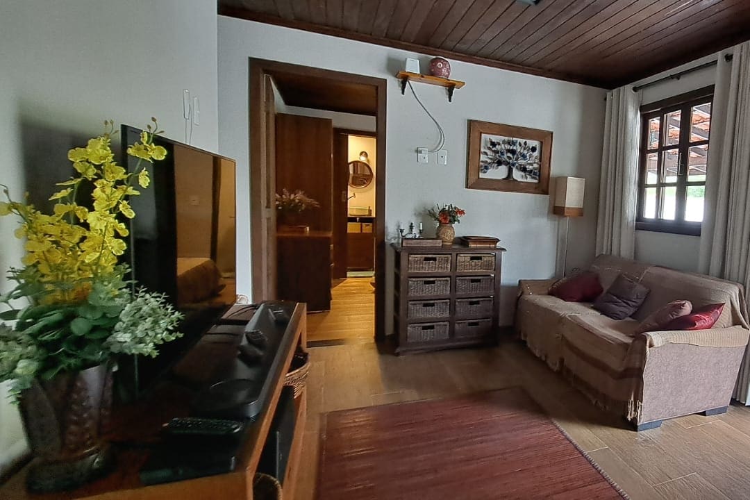 Casa construída com toras de eucalipto, de estilo único e extremamente aconchegante. Do interior, para onde se olha, é possível apreciar o verde da natureza através das amplas janelas e vidraças, criando uma conexão constante com o ambiente ao redor. A propriedade oferece diversas opções de lazer, como spa com água aquecida, sauna, churrasqueira e forno iglu. Para os amantes da natureza, há trilhas para caminhada que levam a cachoeiras localizadas bem próximas.