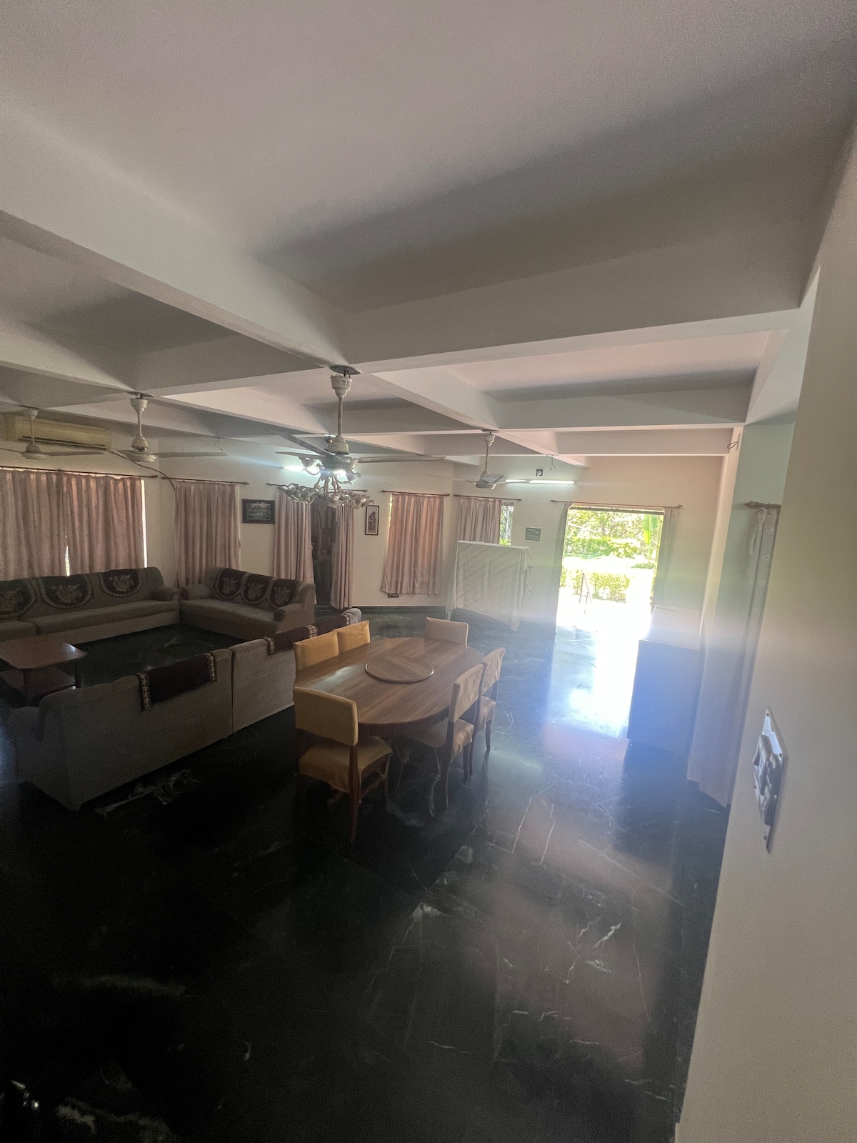 床上可供26人入住。 地板床墊每人加收1500盧比。 美麗的別墅,佔地24000平方英尺,有7間臥室和9間浴室。 嚴禁攜帶寵物。僅允許攜帶有證明文件的服務犬。 羽毛球、排球、飛鏢板、西洋棋、卡拉姆、紙牌、棋盤遊戲。 可直接進入40,000平方英尺的OM宴會和派對區,提供4500平方英尺的空調宴會,可舉辦婚禮、派對、公司活動等。可停放200輛車。 允許活動,需額外付費。