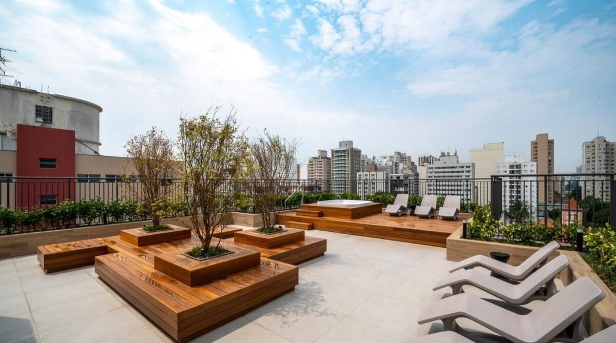 這間全新的單間公寓位於市中心的文化中心,有博物館、電影院和商店,距離Rua Augusta僅兩個街區,距離Av僅幾分鐘路程。 Paulista ,聖保羅最好的夜生活和美食地區。 快速可靠的WiFi 交通方便,步行5分鐘即可到達Paulista、Consolação和Higienópolis/Mackenzie地鐵站。 大樓有完整的24小時健身房和洗衣設施。 1輛車的免費停車位。 100英寸電影螢幕,可收看Netflix和Prime影片。