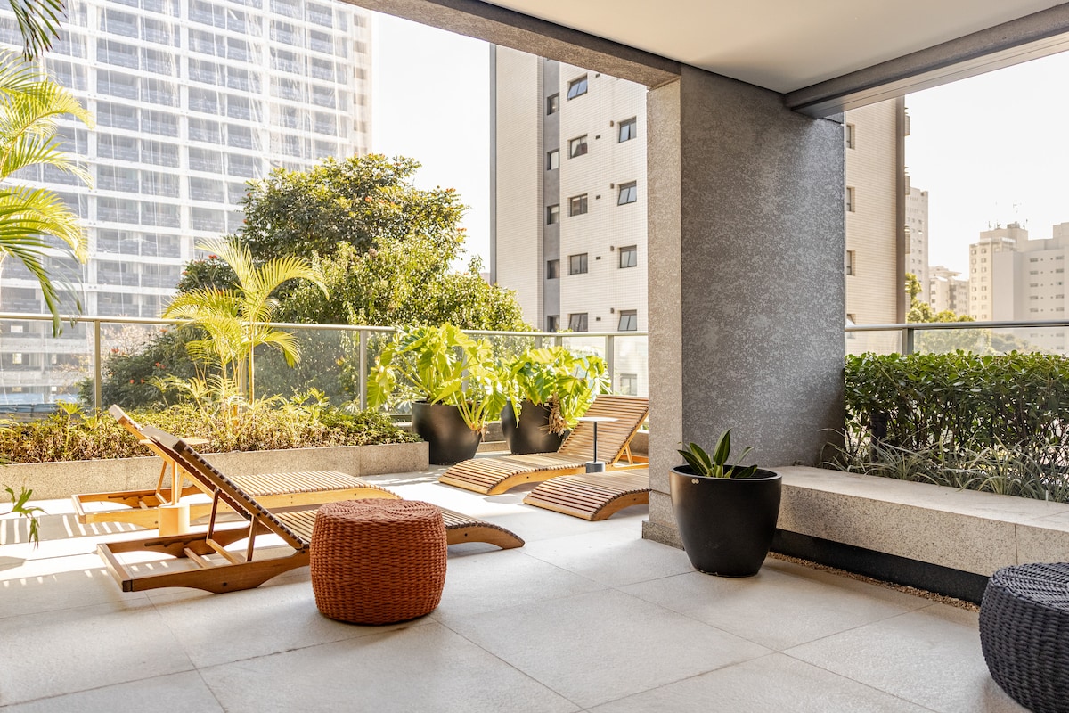在乾淨的閣樓中享受精緻的純粹設計氣氛,全景陽臺被大自然的華麗環圍,俯瞰聖保羅市商業中心的垂直花園中。 享受吧! 這套公寓融合了作者設計的簡單性與舒適的住宿體驗。 環氧樹脂地板設計能夠赤腳行走,享受光滑的質地,在聖保羅炎熱的日子感覺清爽。 陽臺是特權的地方,因為除了全景之外,它還有一個華麗的垂直天然花園,由約80種美麗的植物組成,配有自動灌溉系統,總是綠色的,帶來強大的大自然元素,在這個「石頭叢林」中是如此重要。 這是一個令人難忘的地方,隨時歡迎您。 歡迎! 泳池、健身房和桑拿房。 我的朋友Ana Catarina和我可以透過訊息全天候為您提供任何問題的協助。 Itaim Bibi ,是這座城市中最棒的街區之一,適合那些想享受樂趣和生活在波希米亞生活的人。 但這個街區還有公園、自行車道、健身中心、各種商場、文化中心、電影院、超市和各種商店。 平坦的街區邀請您步行或騎自行車。