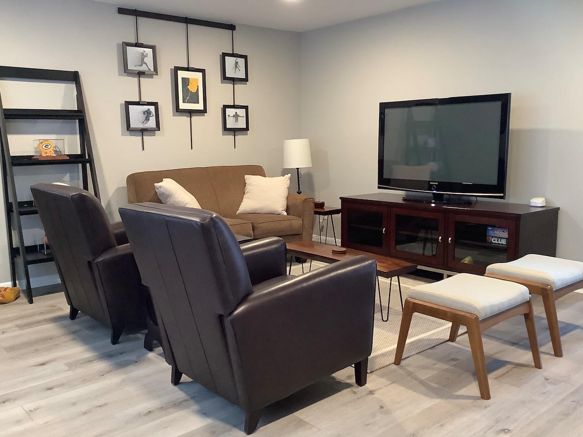 河畔度假屋,極致舒適、寬敞,靠近蘭博球場。五台55英寸平面螢幕,配有Roku!按摩浴池、烤架、圍欄庭院。廚房設備齊全!Ex-lg島兼作遊戲桌。衣櫃裡有很多遊戲供您享受。步行即可抵達釀酒廠、餐廳、咖啡廳、晚餐俱樂部、步道、Walgreens... 2個壁爐和最快的網路。可容納10人。3間全套浴室。車道停車位充足。主臥室套房。大型辦公室,配有雙人桌,4季房間,配有酒吧桌。