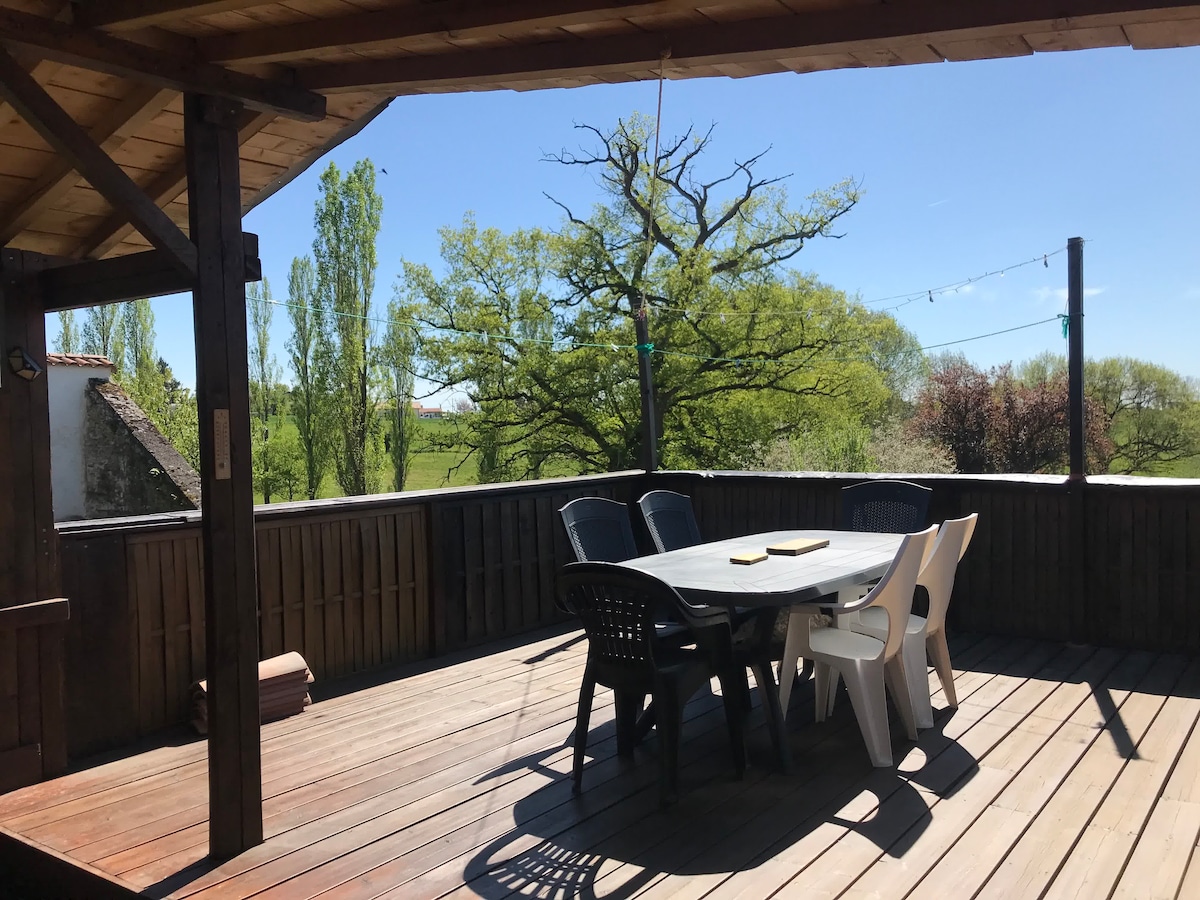 La Grange, en pierres blanches et charpente bois a quelques décennies. Au centre d'une propriété agricole, elle a été entièrement rénovée. Le gîte est de plain-pied, gardant le charme d'antan. Une grande pièce de vie avec cuisine toute équipée, grande table à manger et coin salon vous offrira de délicieux moments de partage. Vous pourrez profiter de la terrasse avec son salon de jardin et son barbecue. Lac privatif pour la pêche ou moments de détente. La piscine, commune avec nous propriétaires.