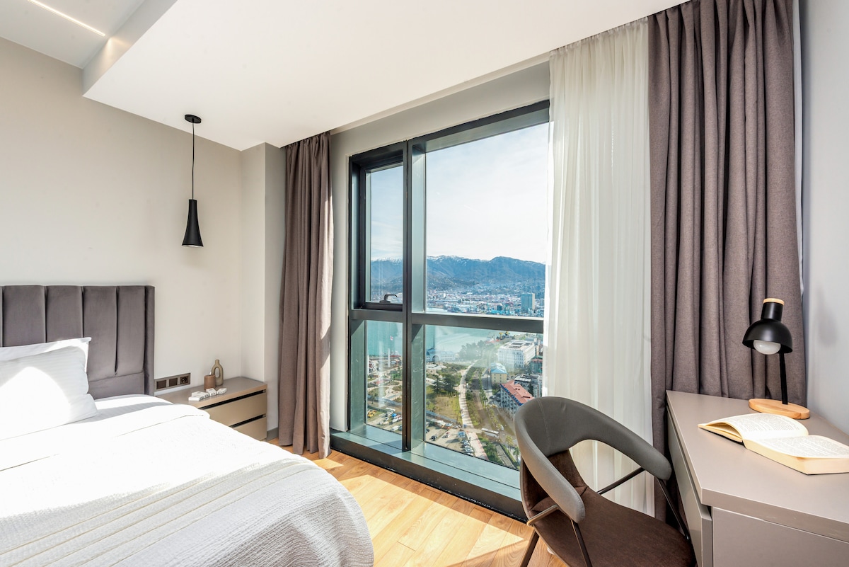 A fully furnished, spacious two-bedroom apartment in the heart of Batumi, with a panoramic view the Alphabetic tower and the Black Sea.