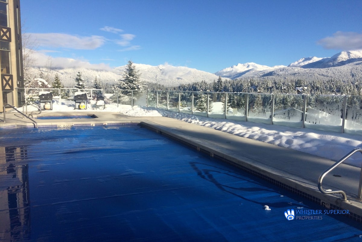 歡迎來到您的山間綠洲。 步行 1 分鐘即可抵達黑梳滑雪纜車! 我們的現代公寓是明亮、寬敞的 1 間臥室,窗戶環繞,可欣賞完美的樹木和山景。 在廚房桌子上喝咖啡時,抬頭就能看到惠斯勒山! 套房配備了所有設施: -加大雙人牀 -沙發牀 -全廚房 -按摩浴缸 - Keurig Bose喇叭 -中央空調- 2025年7月升級 大樓有健身房、洗衣房、泳池和室外熱水浴缸。