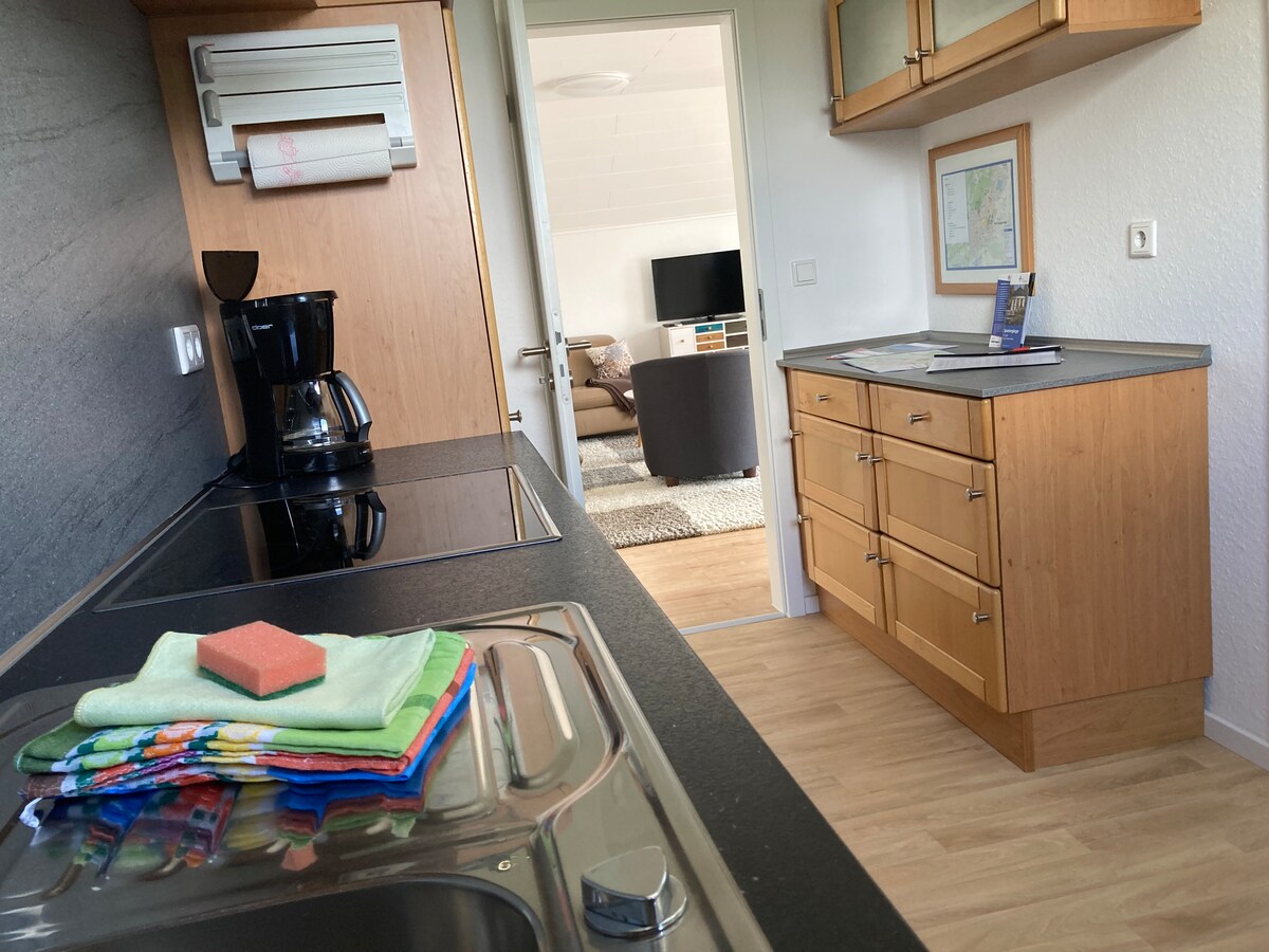 The "Egge Resort 7e" apartment in Altenbeken offers 48 m² of space for up to two guests. It features a living-dining area, a fully equipped kitchenette, a separate bedroom, and a bathroom. The kitchenette includes a dishwasher, microwave, fridge with small freezer, double cooktop, kettle, toaster, and Philips Senseo coffee machine. Bed linen, dish towel, two sauna towels, two bathrobes (XL), two large, two medium, and two small towels, plus three bath mats are provided.