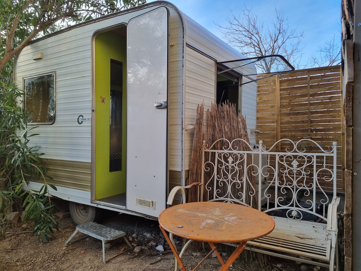 La Caravane a été rénovée puis installée dans un écrin de verdure, au milieu de notre jardin. Le confort est très simple, toilette sèche et douche (chaude) sont à l'extérieur . De votre camping "privé", vous pouvez découvrir le patrimoine culturel et naturel du Vaucluse. - Parc d'attractions Spirou et Wave Island à 5 mn - Avignon, Orange, Isle-sur-la-Sorgue, les Dentelles de Montmirail à 20 mn - Mont Ventoux à 50 mn - Arles et la Camargue à 1 h - les plages méditerranéennes à 1 h 30